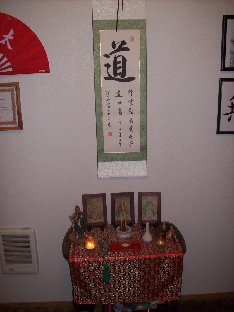 Altars are very personal things, and form the locus for one’s daily spiritual practice. It contains symbolic representations of deities or concepts held sacred to the adept. It also contains ritual implements to aid in paying homage to those deities or concepts. There are many articles on the Internet regarding Buddhist altars, but there are far fewer resources for Daoists. Here are some guidelines for setting up an altar specific to the practice of Quanzhen Daoism, its proper care, maintenance, and use. Throughout this article I will make reference to the altar in my shrine/meditation room. As indicated in the title, these are guidelines and they are meant to be just that, not dogmatic rules.